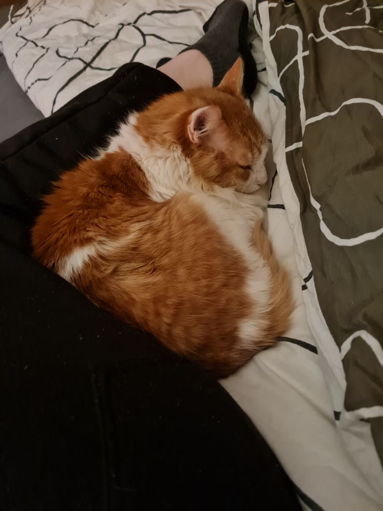 My favourite activities include sleeping next to you, getting pats from you, following you around anticipating food and of course, eating all the food. I got my teeth taken out so if I try to love bite you it's really more of a love gum! My best buddy Fish loves to play with me, so I can't accidentally hurt him either. He's a bit smaller than me!