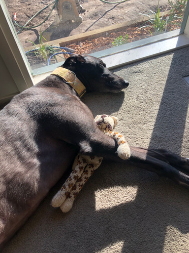 If medals were given out for greyhound roaching and bowing – Stevo would make the podium. He’s also a pro at sleeping on soft spaces (often with tongue hanging out) or anywhere he can catch a ray of sun. He is a smart boy too, learning to shake hands in just 3 short lessons and an expert in getting and out of the car.