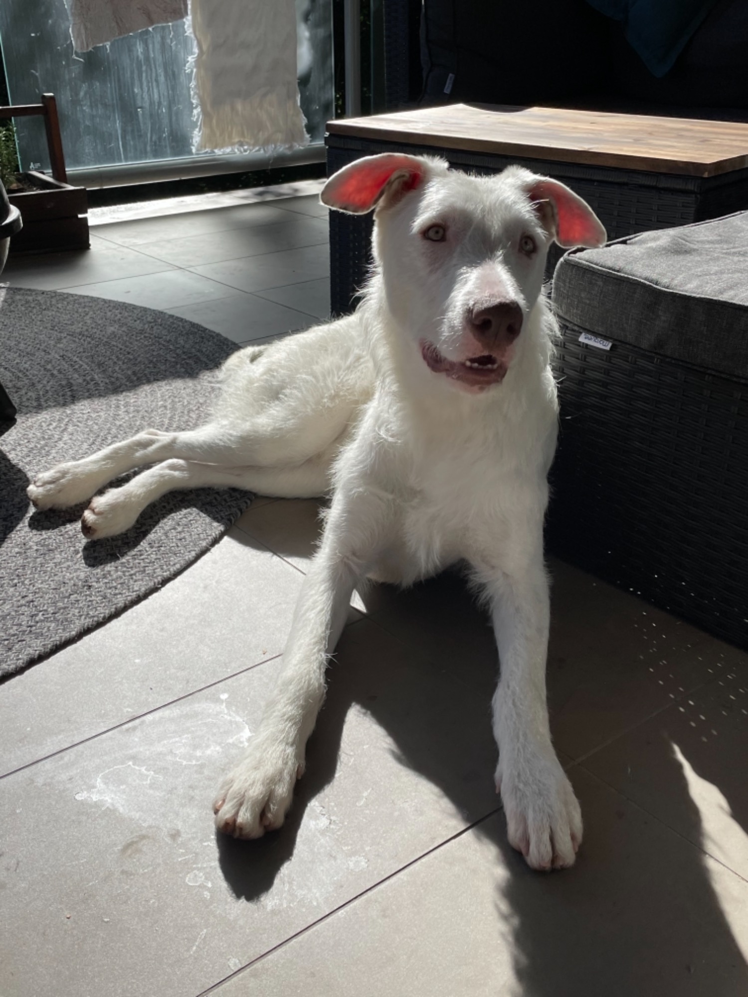 Ghost is like a big border collies or small wolfhound. He has soft wiry fur down his back, like a wolf. He is extremely popular wherever he goes, this is down to his loving nature.