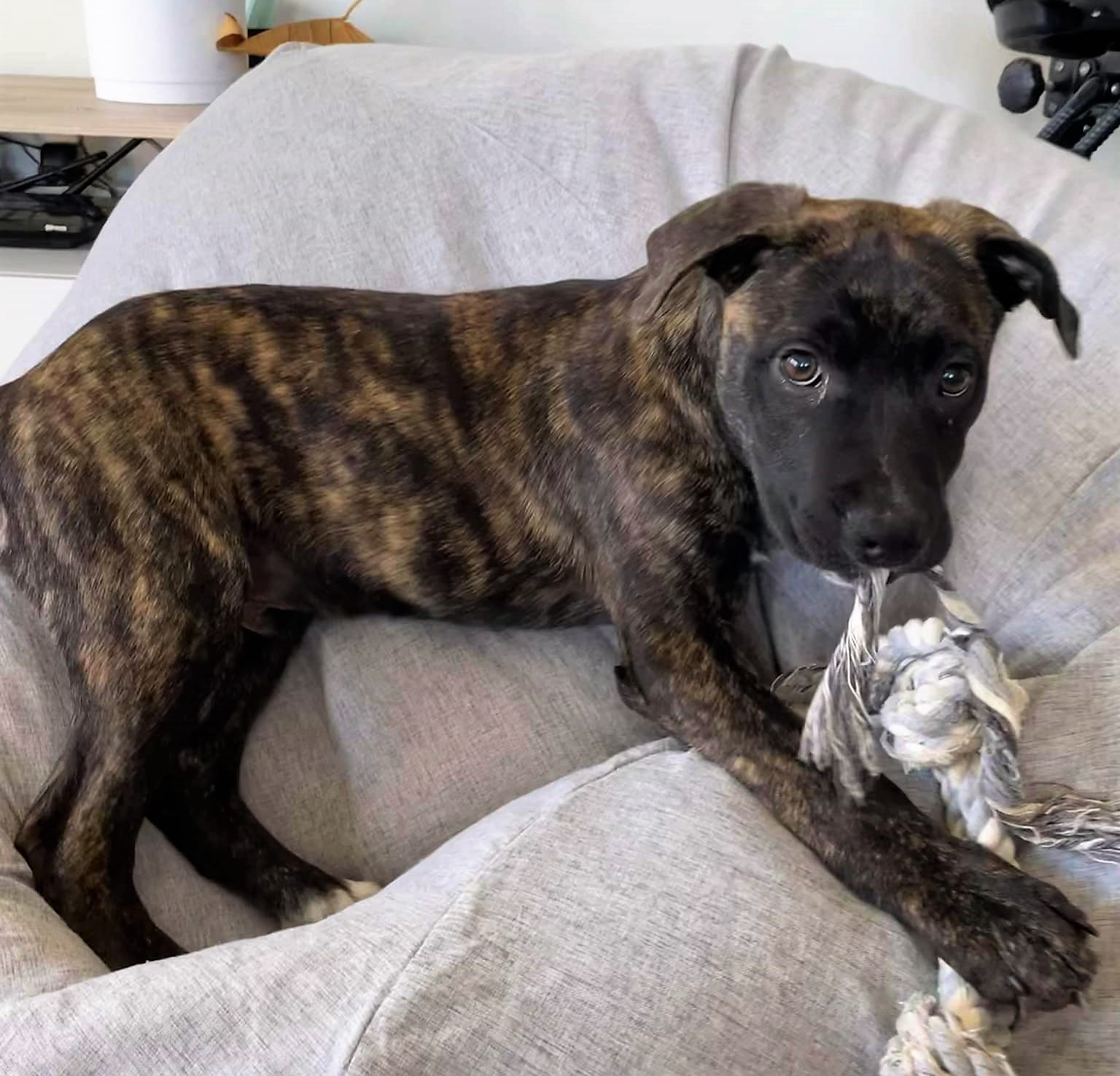 Zolak is our resident cuddle needing, peanut butter loving brindle baby.