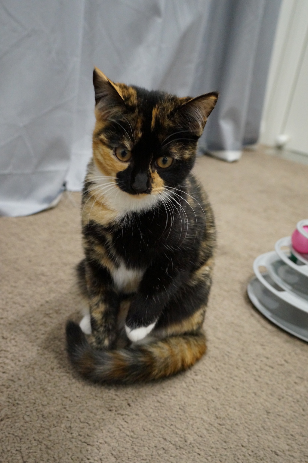 Aphrodite is a 4 months old kitten. She is a sweet and playful tortoiseshell goddess! Aphrodite was the first brave girl to come out of the safety of the carrier when she arrived in her foster home with her sister, Athena, and begin to explore the big wide world around her. She can still be a bit nervous with sudden noises and may run off to hide, however, she quickly decides all is safe and comes running back out happily to continue her play and exploring. Aphrodite loves pats, especially head pats, and will gently meow as she's falling asleep while you pat her to let you know she's so happy. She will also meow for your attention if she feels it's time for some more pats! She's so very soft her fur feels like stroking a cloud. Our prediction is that Aphrodite will become quite the lap kitty and would cuddle on your lap for long, snuggly snoozes.