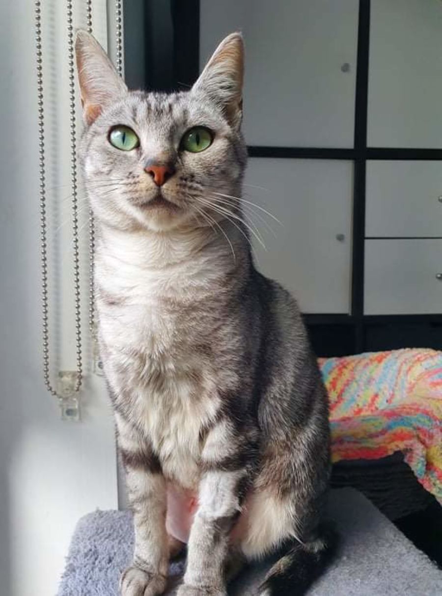 Cleo is a platinum tabby goddess who came into care with three of her kittens. She was initially on edge in her new environment but was quick to settle in and was a great mama to her kittens who have now since grown up and found their own forever homes. Cleo is a superstar who even took on another litter of 4 orphan kittens and nursed them as if they were her own.