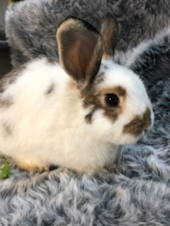 Penny is a pure white bun who is around 12 months old. She will just melt into your arms once she overcomes her initial shyness. Penny loves cheek scratches, pushing her head into your hand for more!