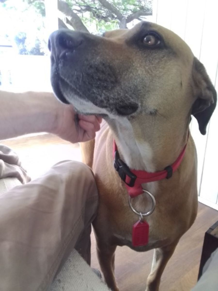 He is a 6 to 7 year old Rhodesian ridgeback mix who is just a gentle boy.