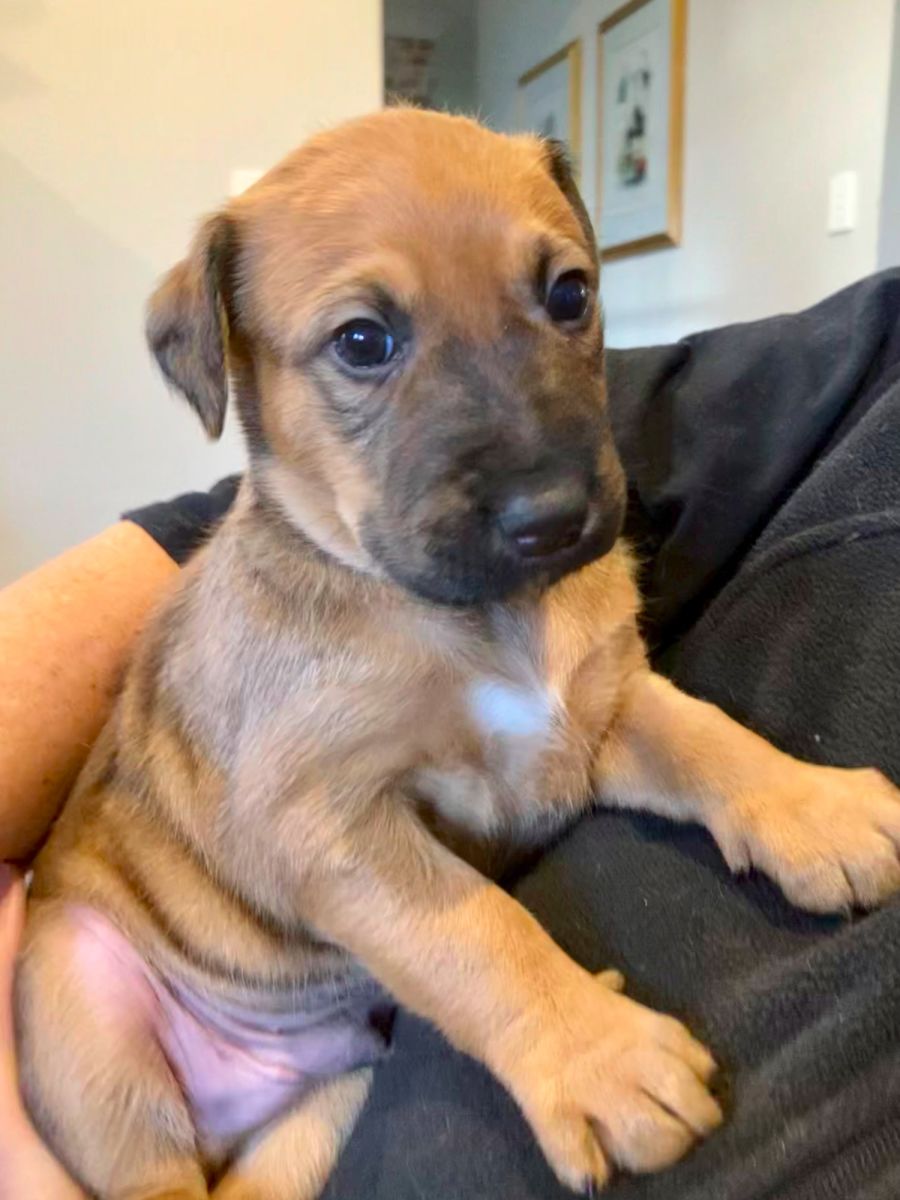 Jimmy's breed is very mixed; Mum is a leggy black and tan beauty (perhaps with some Doberman or Greyhound in her background), and the likely Dad is a scruffy boy (maybe Staffy / Wolfhound X). Judging by their sizes, the puppies could grow anywhere from medium to large!