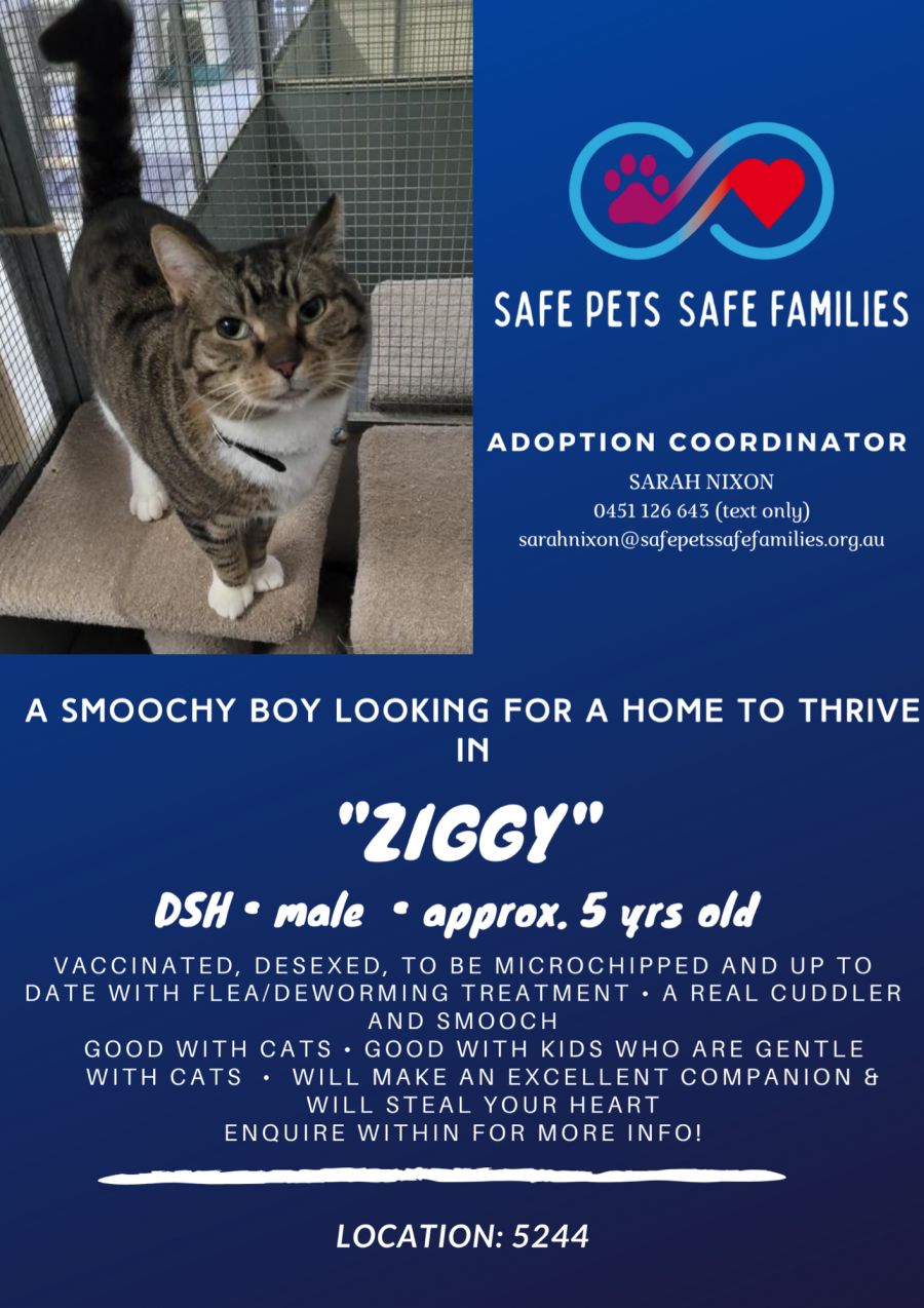 Ziggy is super smoochy, friendly and a joy to be around. He is around 5yrs old and loves humans. He would be an excellent addition to any family, and suitable with children who are gentle with animals.
