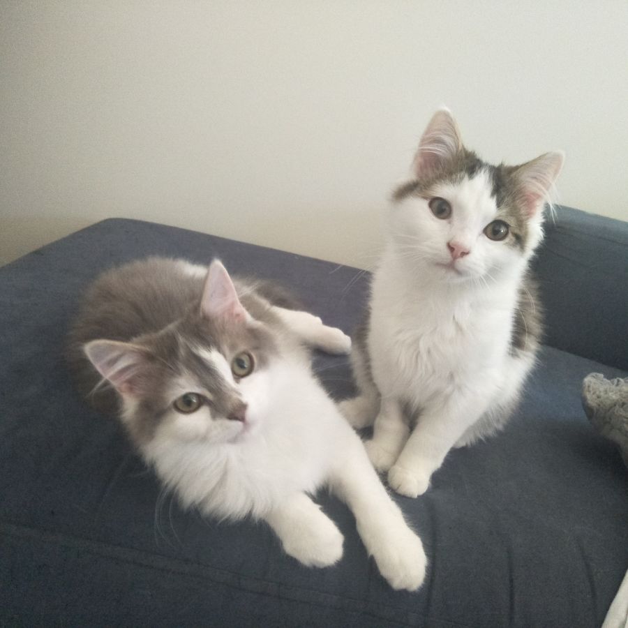 Kai (silver and white) is the larger and more playful of the pair. He is into everything, running everywhere and thinks everything is a game. Kai loves pats and rubbing his body against you, but is much too busy to be picked up and cuddled or sit still in laps. Kai likes to twist himself around, poke out his tongue and just look plain adorable.