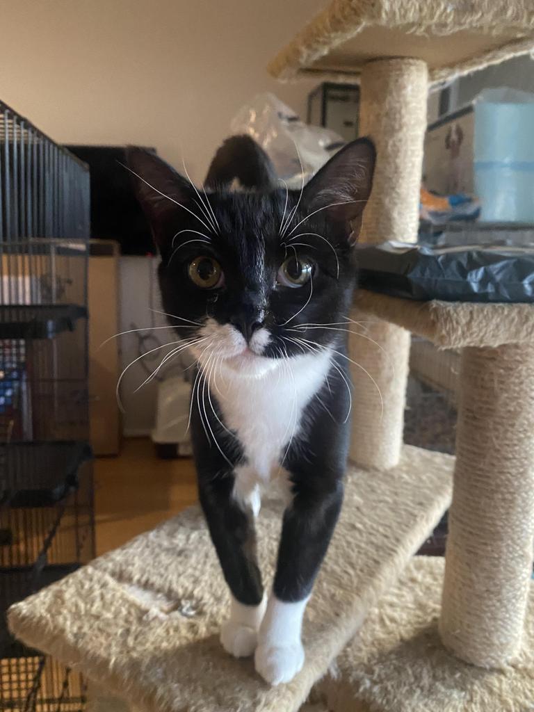 Doggie the incredibly easy going handsome tuxedo kitten wandered into someone's house and refused to leave. That's how Doggie got rescued, and he got his name because he follows you around like a dog (but isn't).