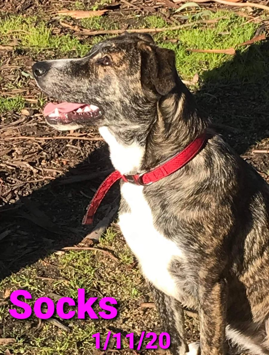 Socks is German Shepherd cross (we suspect Staffy). She weighs around 20kg.