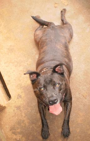 Tank was rescued from the pound with a few hours to spare. Tank is a gorgeous soul of a staffy. We named him tank as he is very round and solid like a little tank, he comes to under your knees, but is very strong when he gets going and loves people as well as other dogs. He plays well, advise probably a more submissive, playful (not over the top excited) dog if you want to put him with other dogs. He does like to be boss but is willing to be reprimanded, very clean ears/eyes/teeth and needs exercise and a diet! :)