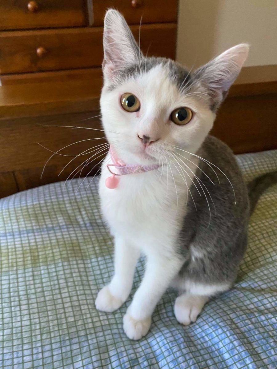 Molly is such a sweet little princess. She may be our little Molly Mouse, but she is definitely the boss of her two brothers. Once she gets to know you, she will be happy to spend hours with you cuddling on the couch or snuggling with you in bed. She is such a playful but gentle little kitten. Her favourite games are chasing ropes or lasers and trying to catch the ties from your hoddie. Molly currently lives with her 2 brothers, 2 small dogs, a 4 year old cat and 5 humans so she is use to a busy household but I’m sure she would be just as happy having 100% of your attention. Are you looking for a companion with endless unconditional love? If you are, please fill out an adoption form.