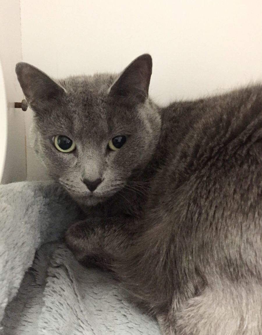 Although Meow Meow looks very serious in her photos she is a beautiful grey cat who appears to have some Russian Blue in her DNA. She has no tail- we're not sure why, and she is definitely looking for a forever home.