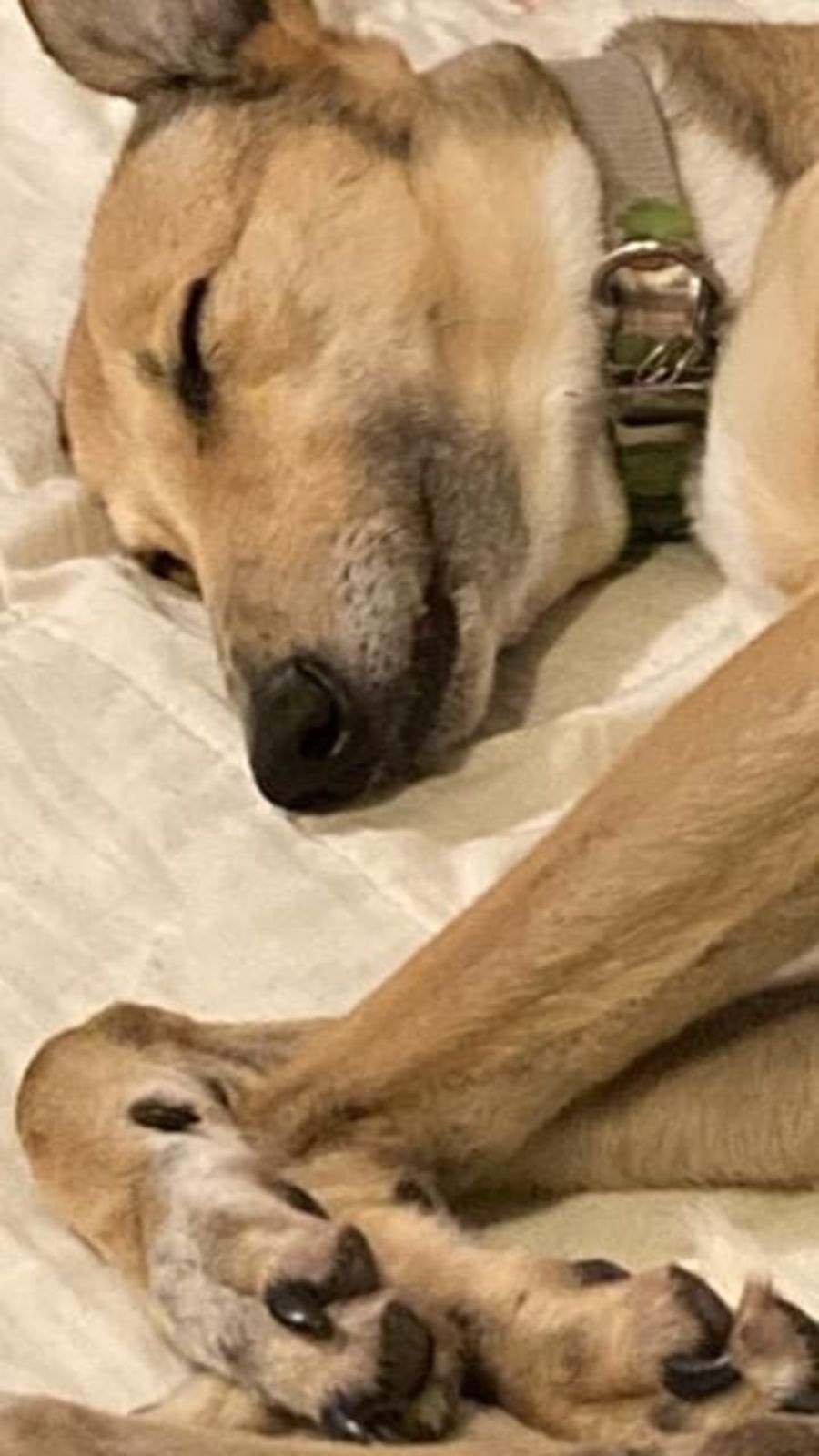 Having been bred several times, Layla has a very mature calm quality unless you are a cat or a small dog! That’s when her natural instinct will kick in. She isn’t bothered about birds and is perfectly polite when passing other dogs on her walks. She is very bright and picked up her new foster life easily. Her favourite pastime is snoozing but if you are available for a cuddle she loves you to join her and is very affectionate. She hasn’t come across children yet, but she is so loving I think they could easily be introduced. At the moment an excited spaghetti leg dance greets you in the morning and I think with more time she will be more playful. She enjoys her walks, and is very good on the lead. A beautiful dog needing a loving home.