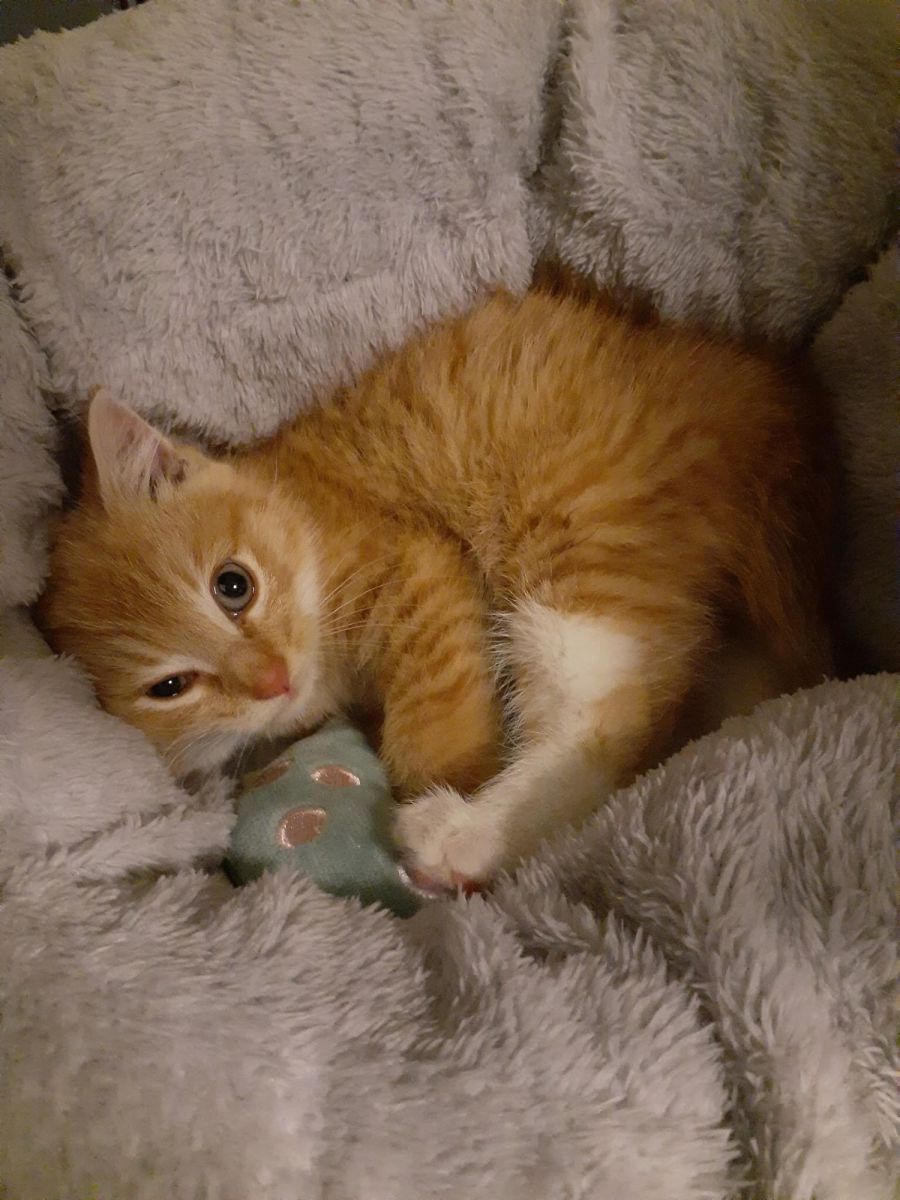 Crumpet is playful, friendly and snuggly. He is great with children and other cats. He loves to play with his toys.
