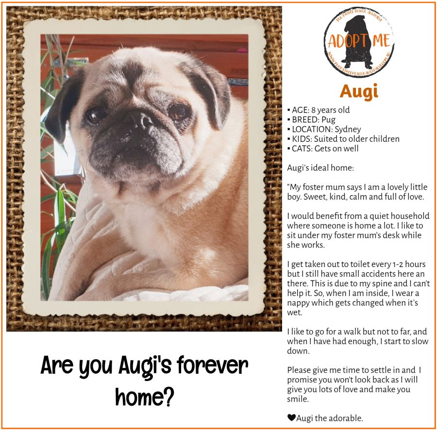 If you believe you are able to provide Augi with the loving home that he deserves, we would love to hear from you.