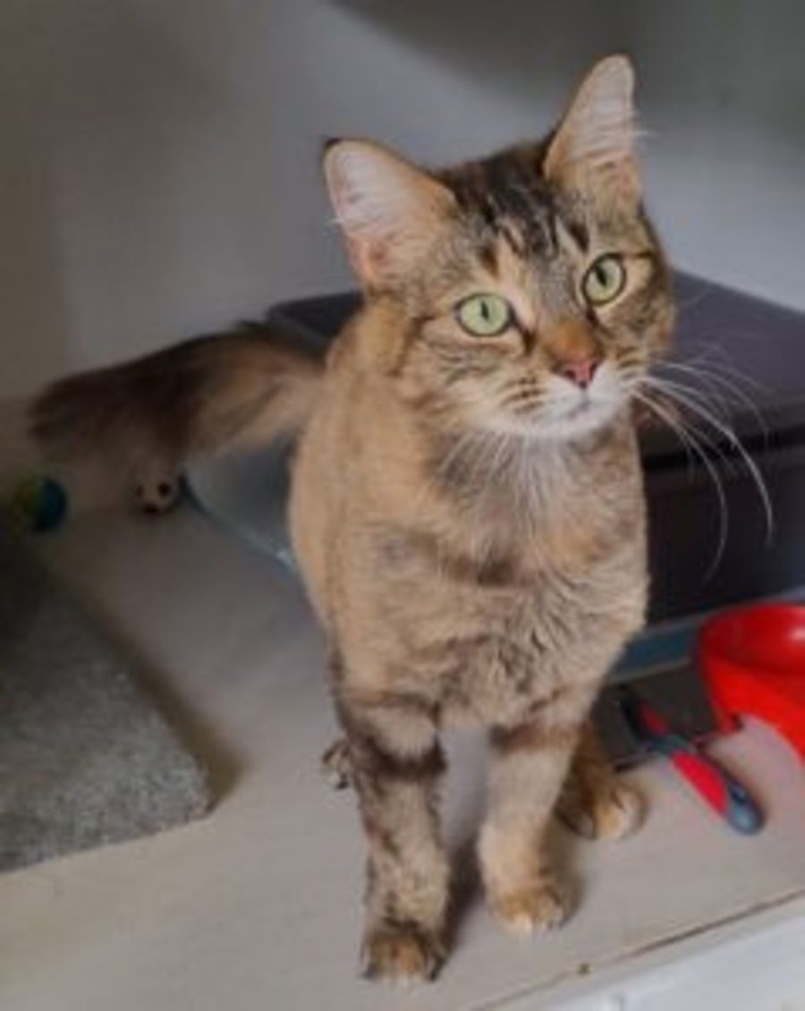 Ellie is a stunning tabby green eyed girl who is 5 years old. When she arrived at SAFE her medium length fur was quite matted and she had to be clipped. As a result she looks a bit strange at the moment. It goes without saying that her coat will need ongoing maintenance and you will need to brush her every day to keep her coat in good condition.