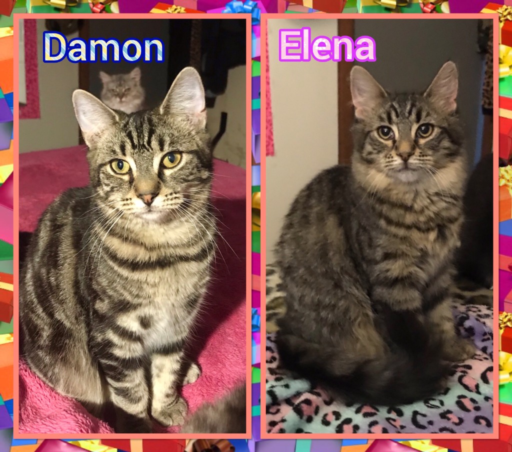 Damon and Elena came into our care with their siblings Stefan, Jeremy and Tyler after living as strays in someone’s backyard. They are both beautiful bonded cuddly tabby snugglers. Elena is the fluffy more shy one of the two. She’s most happy lazing about in a warm patch of sun, or playing with her favorite toy “da bird”. Damon is a super snuggly Mummies boy! Initially he is very shy, but once you gain his trust he will be your best friend. Damon loves cuddles and warm laps, and will cover your face with smooches and head bops. He is incredibly affectionate and will insist on sleeping under the covers with you. Both kittens have grown up with a variety of other foster cats and kittens so they are very well socialised.