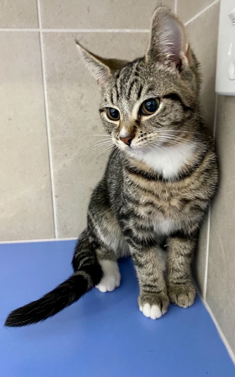 Purriah is a very sweet and affectionate kitten but don’t let this fool you. She is also very playful and mischievous and loves to rough and tumble with her siblings. She gets along well with other kittens and some cats. She hasn’t really been around dogs but is fairly laid back and young so it wouldn’t be hard to introduce her. This lovely little girl will make someone very happy.