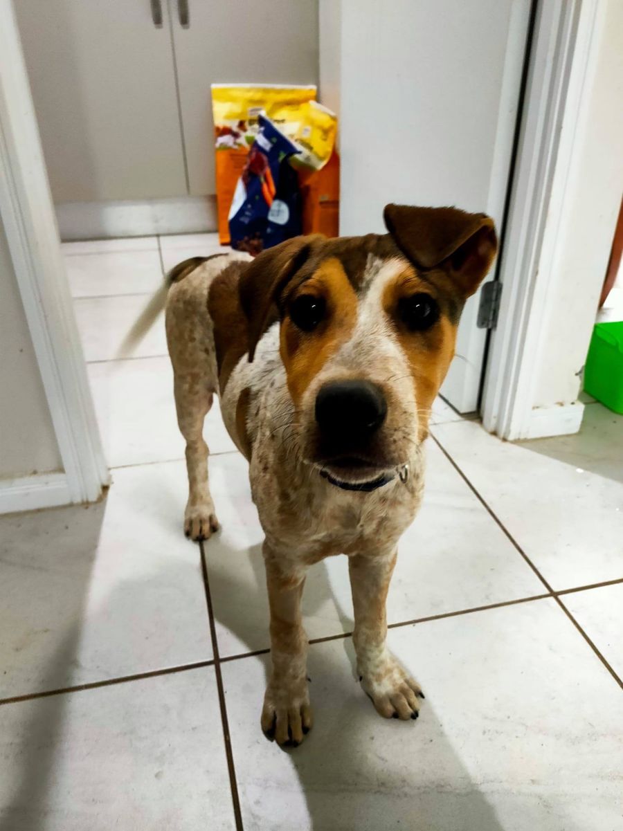 Hi, my name is Chips! I am new into care but my foster mum says I am pretty chill for a puppy and my tail never stops wagging. My foster fur siblings pounced on me and I felt at home right away. I love to play chase and wrestle with them but I'm also happy curled up next to my hoomans for some R&R.