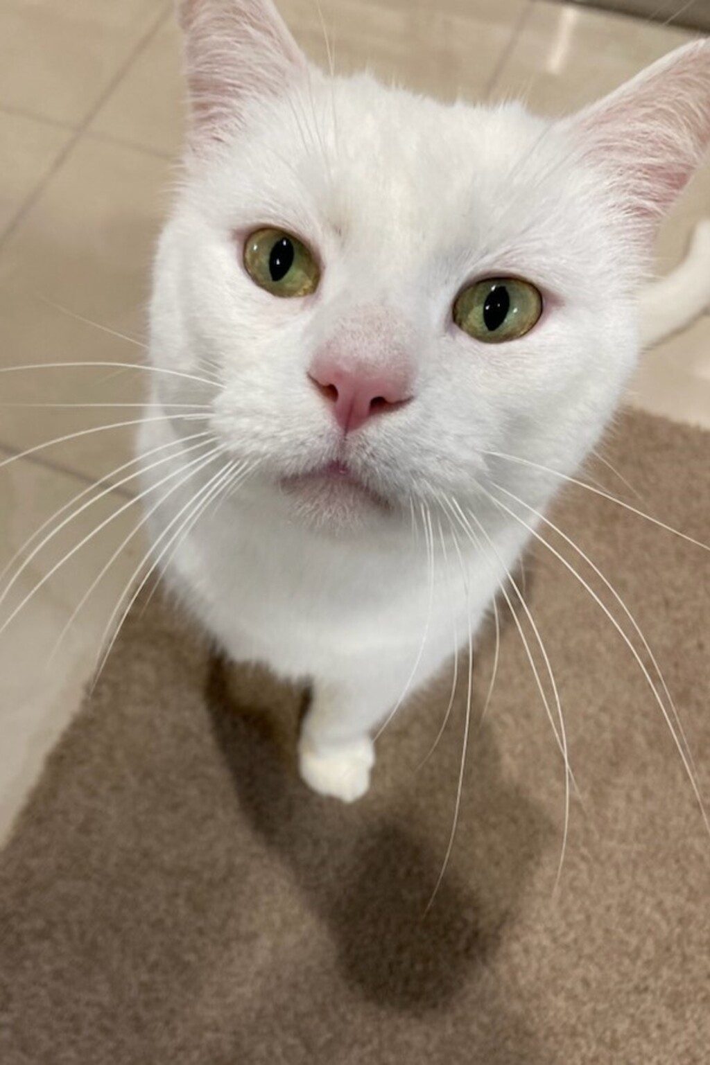 SNOW #365C is a gorgeous pure white boy who is initially shy but is very happy to follow you around the house to supervise your work once he has decided you are OK. We think he is about 4 or 5 years old and will need to be given some time and space to come out of his shell but will end up being a very lovely, affectionate pet. Snow will need to be an inside cat as his white coat and pink skin make him very prone to sunburn. Snow will be desexed, chipped, vaccinated, worm/flea treated and vet checked.