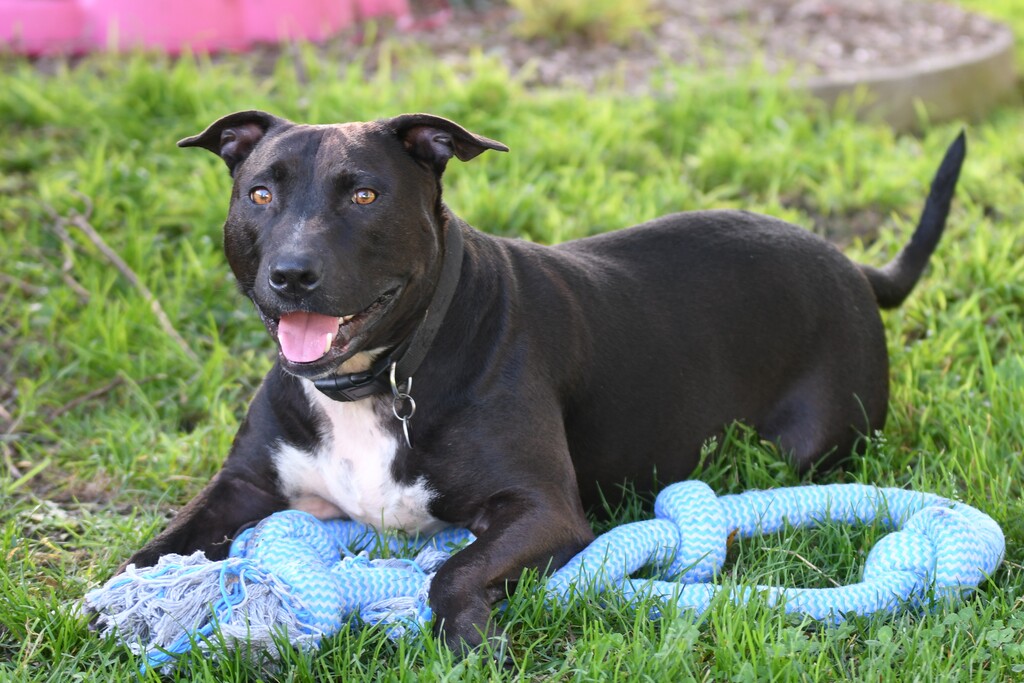 Lovely BANJO #2774 has been looking for a new home for over six months now and we can't quite work out why he hasn't been snapped up! Banjo is a staffy cross bull terrier (we think) and is a big boofy, friendly fellow. He spent his first three years in a loving home and was surrendered due to changes in his family's circumstances rather than for any fault of his own. Banjo would love to be part of a new family - he loves his humans and would like to hang out with them as much as possible. He also loves his toys and will happily play in the backyard for hours, especially enjoying tug of war games! He is housetrained and enjoys travelling in the car. Banjo can still get quite excitable so would probably be more suited to families with kids over 10 and though he is strong he is relatively easy to walk if you use a front fastening harness. Banjo is in foster care with a similar sized female dog and they get along well. Have you got a spot in your life for this loveable doggo? Banjo is four years old and is desexed, chipped, vaccinated, worm/flea treated and vet checked.