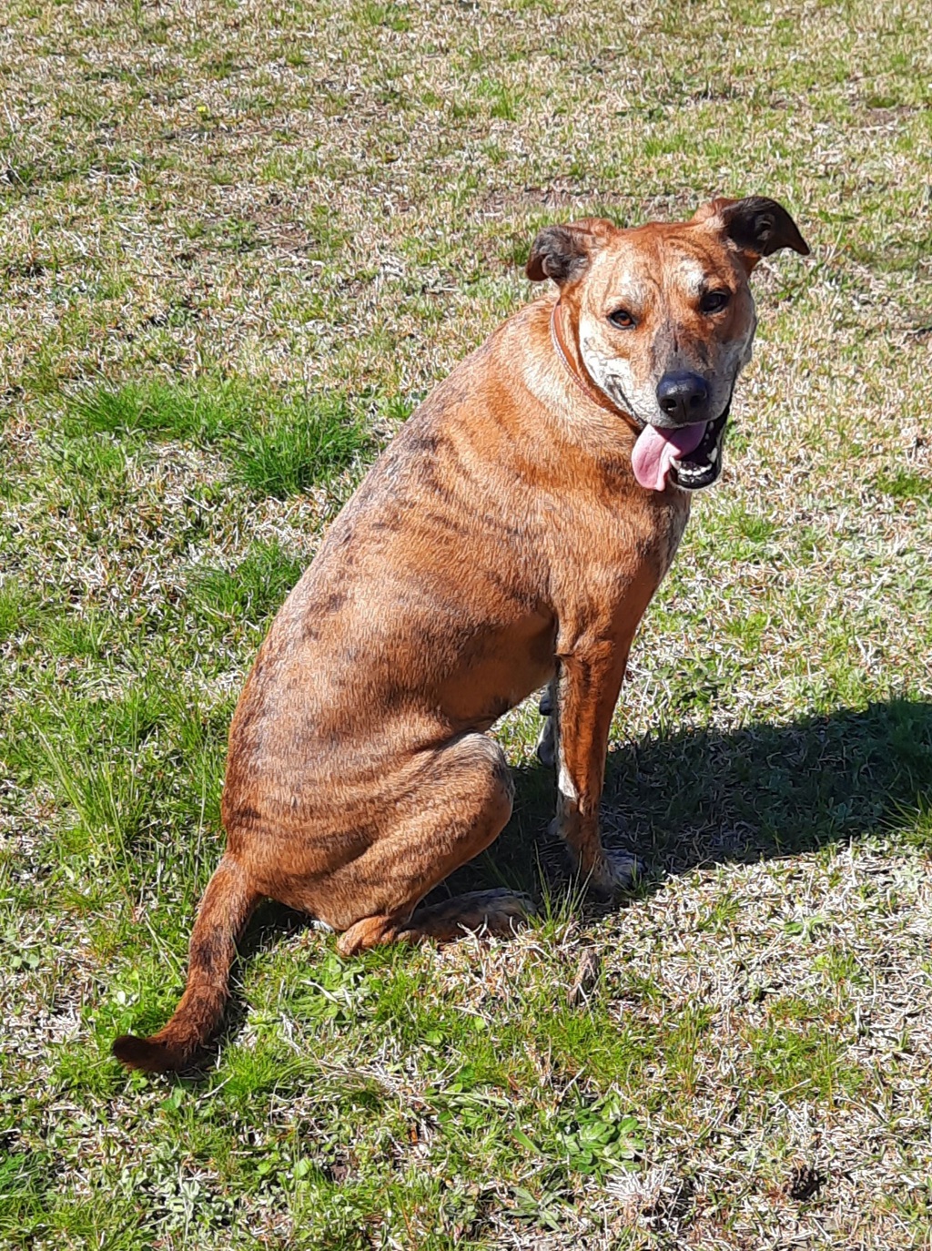 HALLE is a gentle tan brindle mixed breed female dog, 3y4m old. Her coat is shiny, healthy and like a tiger's coat. She is keen to please and should fit in nicely to families with older primary aged kids, an older couple or a single. Halle likes to be around her people, is house trained and would prefer to sleep inside with her family. She plays well with other dogs but she hasn't been taken off her rural property. A gentle and slow introduction to new situations should help her adjust to town or beach living for example. Halle will sit and comes when called. She stays close to home and doesn't wander off. If you can give Halle the love and attention she's craving please call our enquiry line. Halle is desexed, vaccinated, chipped. flea, tick and worm treated.