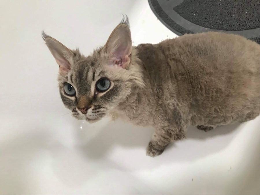 Hugo is a purebred Devon Rex and the long haired gene has really come through with this boy. He was obese when he came into care and has since lost over a kg (and still has more to go) and has also had a full clip as he has been unable to groom himself properly.