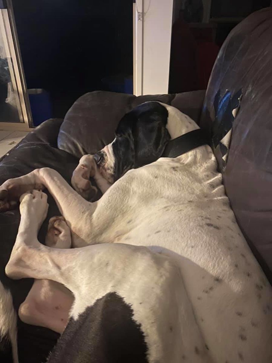 I am just a big goofball who loves humans and I REALLY enjoy the company of my foster brother, he was a bit annoying at first but I finally gave in and joined him in lots of wrestling and zoomies. I am your typical adolescent Dane and I can make a real mess when playing. However, I am not much of a barker and i have no destructive digging behaviours.I walk well on the lead and currently get a 40 min walk every morning, I would love a home where that could continue. I am not suited to homes with young kids as I have already knocked over foster mum when I am zooming! So older kids who know how to get out of the way when I play!
