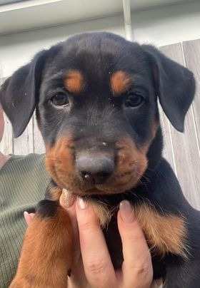 Mum is a Rottweiler x Kelpie with a very lovely nature. We don't know who our father is but he was probably a big dog. Though we've definitely all taken after mum in terms of looks, the girls are little clones of her but the boys have softer coats and are alot bigger and chonkier. I am the smallest in the litter, more needy and cuddly than my sisters but can also look out for myself.