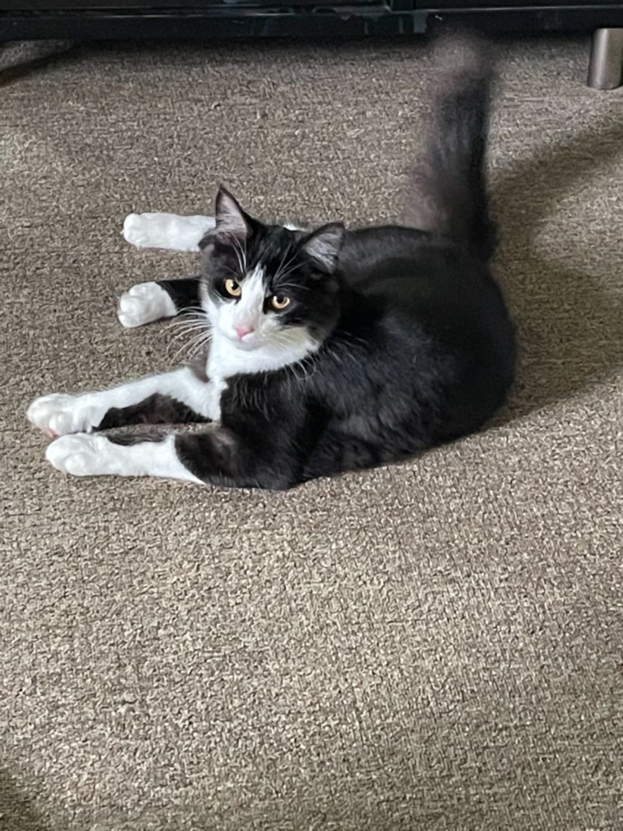 Lenny is a beautiful black and white man, with lovely soft short to medium fur and a nice big fluffy tail.