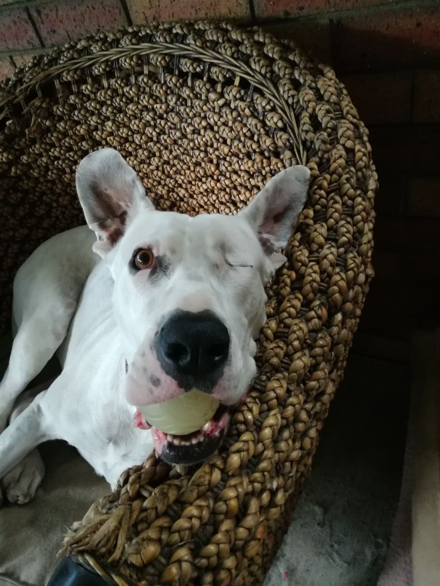 You might think only having one eye would hold me back but don't you worry, I still see perfectly fine with my remaining eye. In fact, I love spending my time playing tug-of-war and chasing balls; mostly with one already in my mouth!
