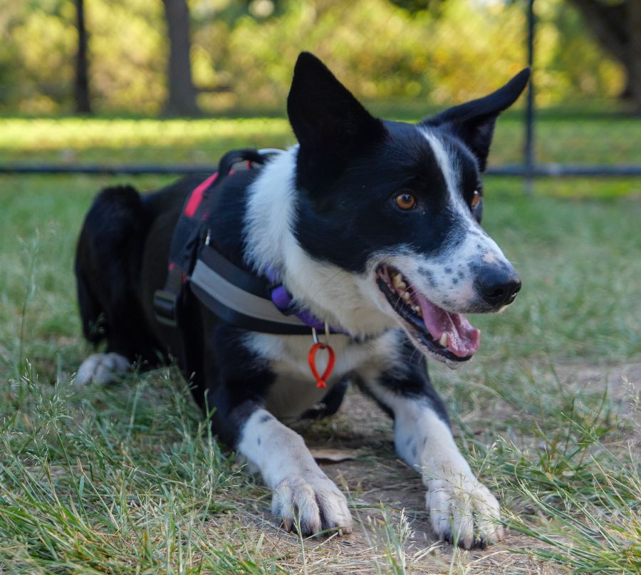 He may be best as an only dog as he can be reactive around other dogs when overstimulated (such as if the other dog is racing about and playing ball or he’s super over excited). His foster family are working on this with Lester currently and he is showing improvements, but if sharing with another dog a calm adult female who doesn’t mind the herding dog style of play, and calm competent human leadership will be essential.