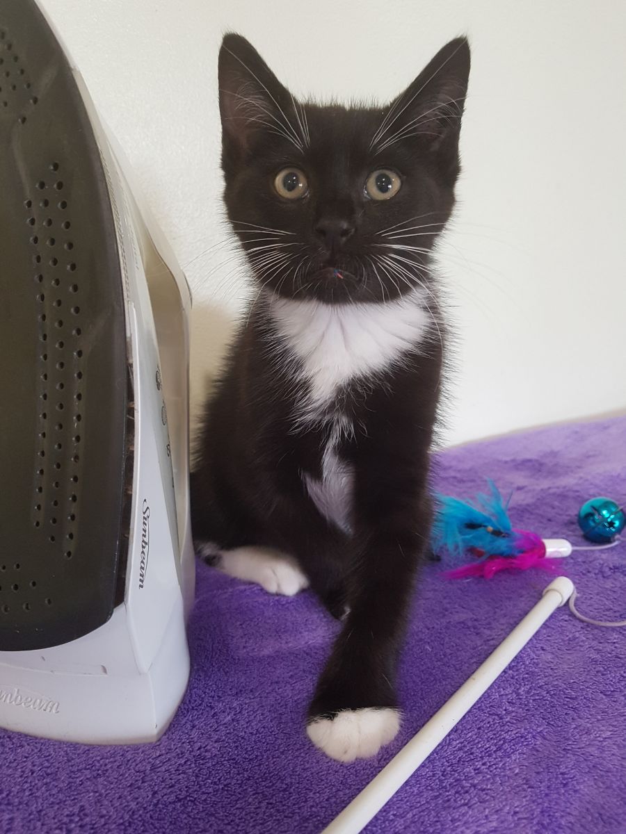 Just rescued from the pound, last week, he is still a little wary but once picked up soon turns on his purring machine. Once he settled in he was chasing the tails of the other cats and enjoyed playing with the toys.