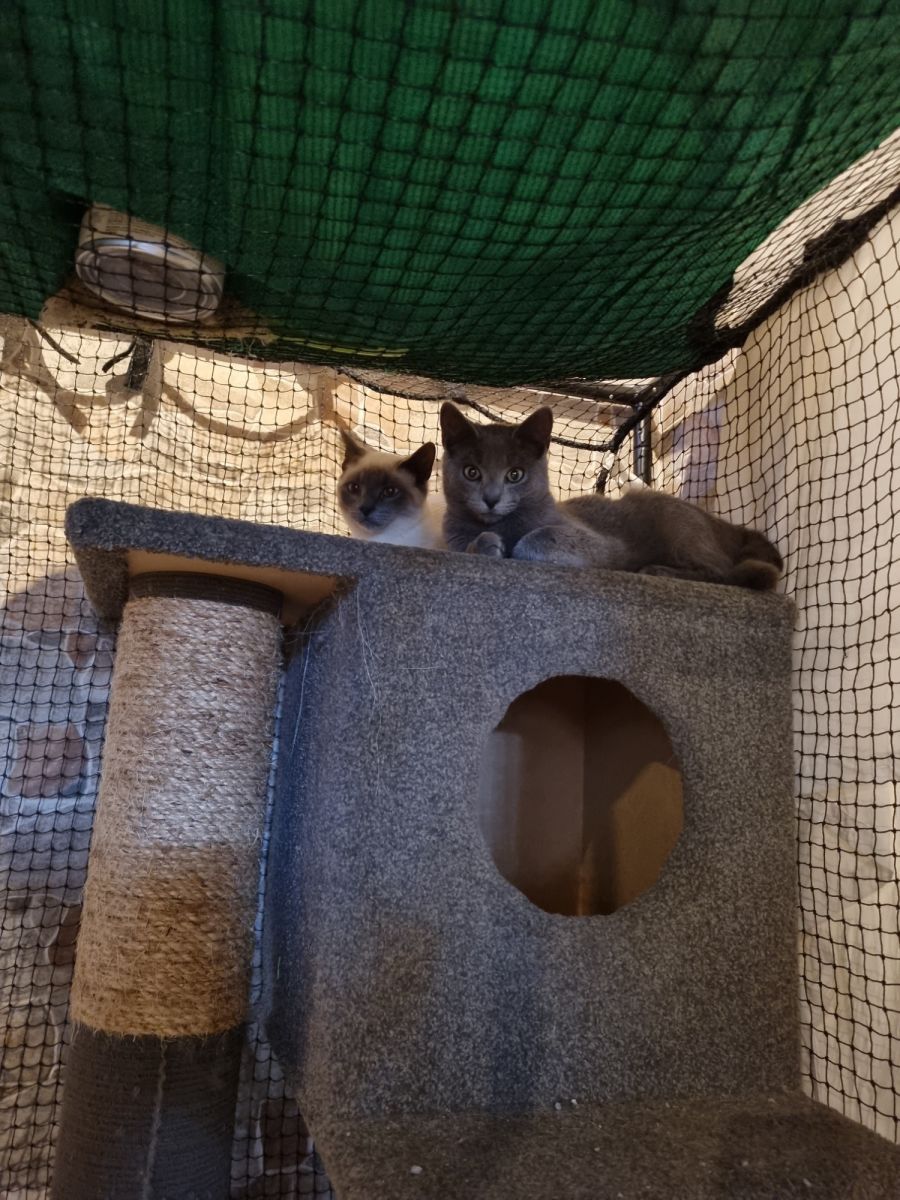 Jalapeño the lilac Siamese is very vocal and affectionate, Popper is still trying to work out that people are ok , he does also have a cute little kinked tail and follows his brother everywhere. They are very bonded and sleep in the same cat bed together and groom each other it's very cute. They spend alot of time on my deck which is cat meshed so if their Adopter could consider something similar I think the would be very happy