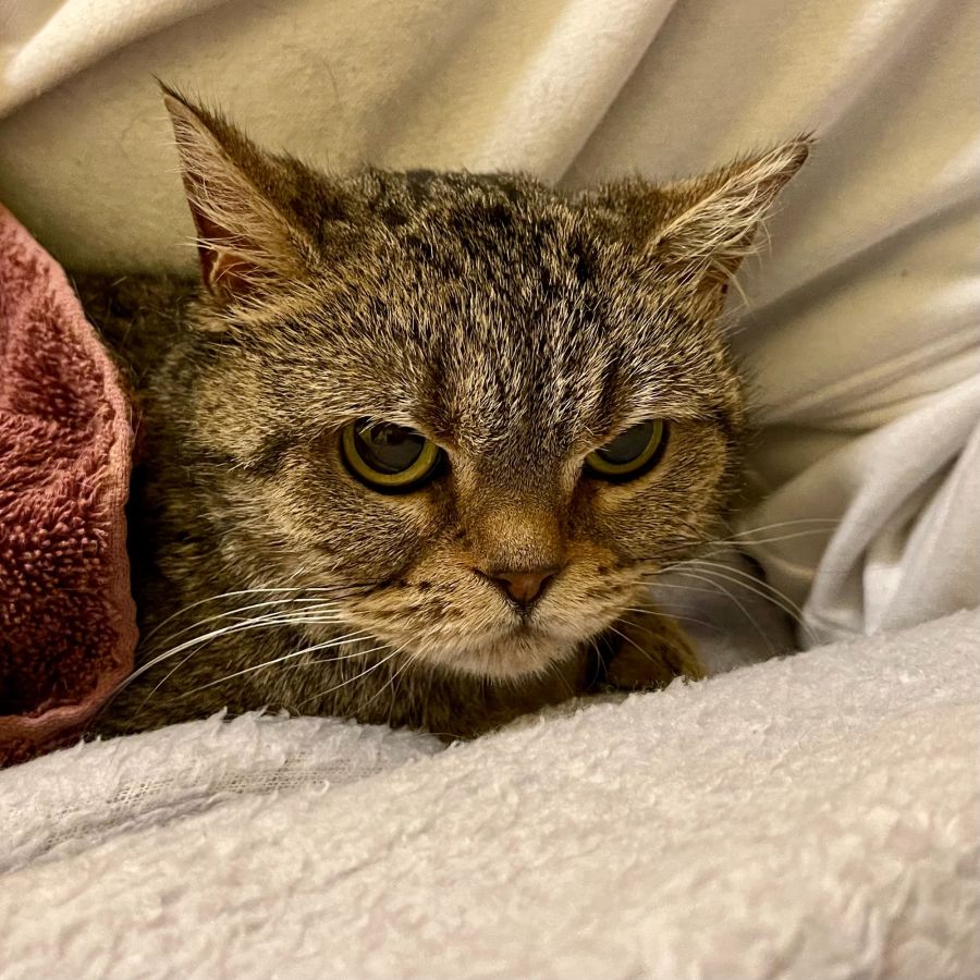 Unfortunately the other cat living there was mean to me and I am not a confrontational girl so I had to be moved. This meant I have gone back to living in my box bed but I have a sweet side just waiting to come out in the right circumstances. I am a low maintenance girl who likes to snooze, eat and have unlimited pats in the comfort of my own blanket and bed. My face looks a little grumpy but really I am a polite sweet girl who just wants home to call my own.