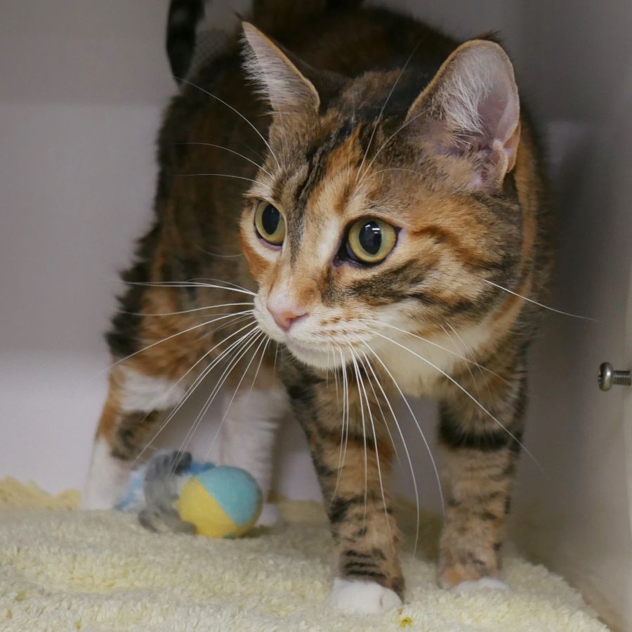 Pepper has lived with a feline friendly canine but has no tolerance with other felines or children. She would not be suitable in a home with a senior as she may give a whack or nip.