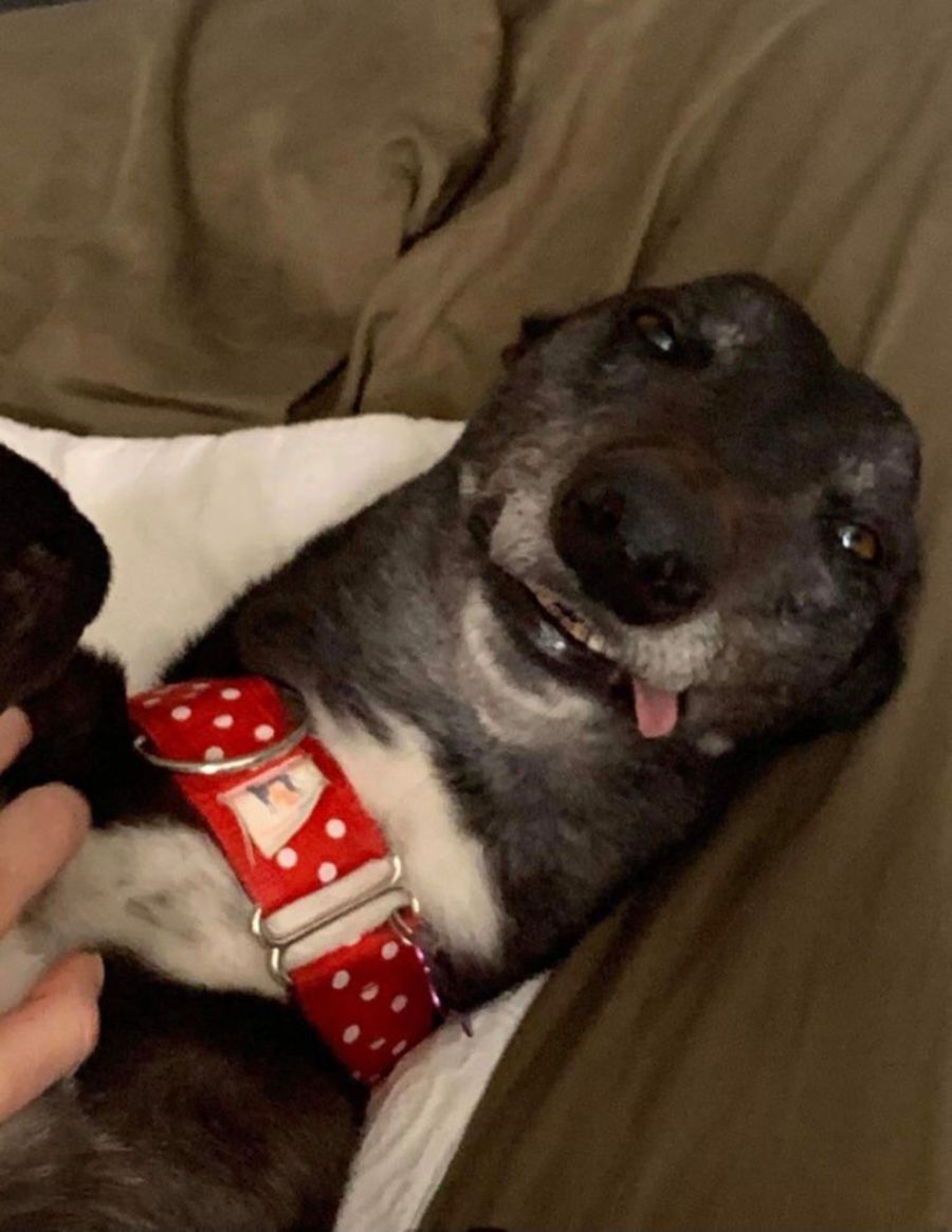 Lenny has a beautiful black coat, gentle brown eyes, wise grey snoot and a white tuxedo chest. He is one lazy hound. Lenny loves to set out on his walks but they can be short, he’s happy to head back home to his comfy bed after 15 minutes. He does however love zoomies in his yard but also happy to snooze most of the day. His favourite time for zoomies after a big fabulous dinner or a most satisfying poo. He will zoom around with a favourite soft toy to entertain you.