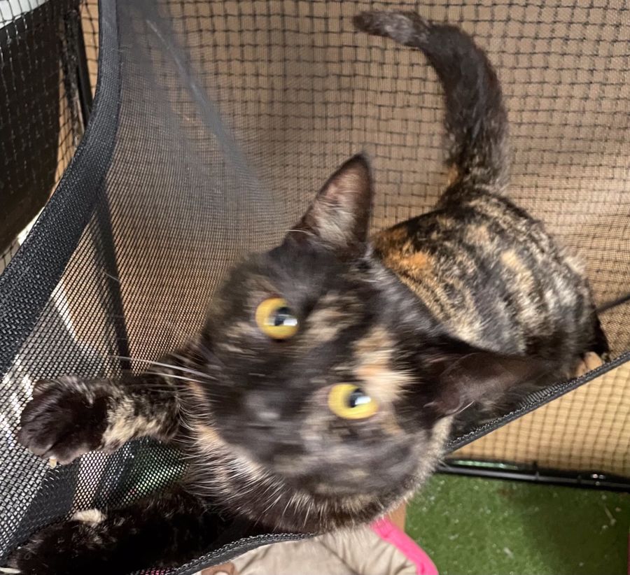 Coffee is a striking tortie girl with stunning markings and colours. She is sweet and very affectionate, loves to rub up against your legs, wanting a cuddle. She loves her hammock and rolls around playing in it. Coffe can amuse herself or is happy to sit and cuddle up next to you.
