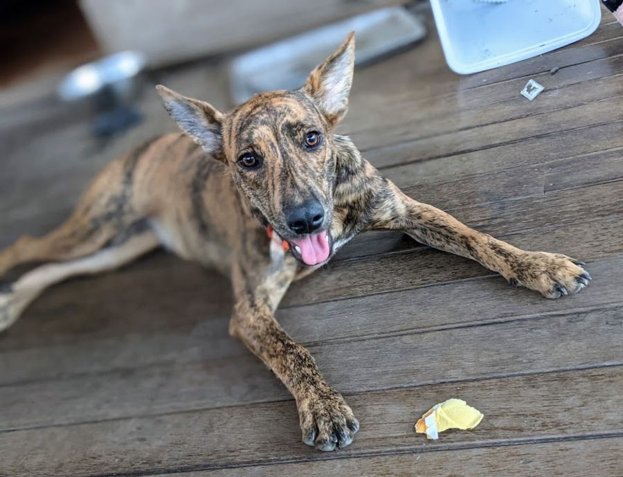 River is clever and very food motivated, which helps her learn new things lightning fast. She has learnt to sit, drop, wait for her food, and wait at the door, all in her first few weeks of foster care.