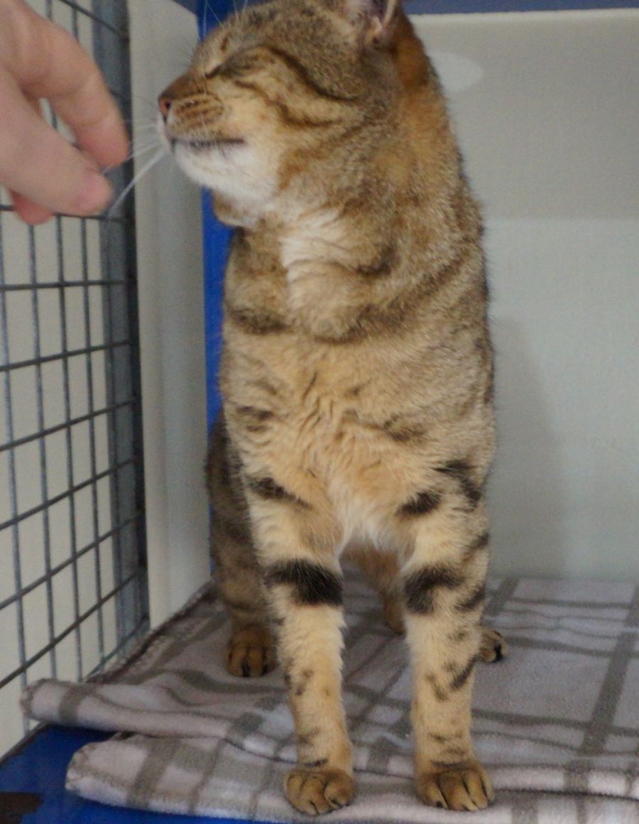 Tobias is a strikingly handsome cat. He is very muscular and well built cat - very fit and in prime condition. From his unusual coat markings and build it is likely that Tobias may have some Bengal in him but of course we cant be sure.
