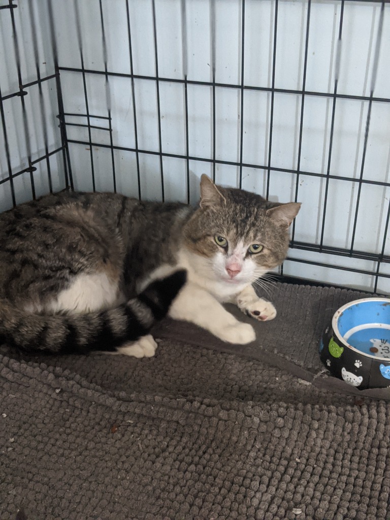 Meet our handsome, talkative, hilarious Oscar. He gets progressively less grouchy as the days go by and is showing his true nature as a playful kitten in the body of a big, scabby, scar-faced cat.