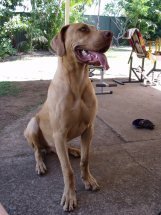 Beau is a great dane x neo mastiff about one and a half years old who has been abandoned by his owners. He is good with adults and other dogs. He has been fine with our cat. He's also fine around children but very curious and a big boy so tends to frighten them a bit and because of his size he does knock them over - especially when playing. He loves cuddles and being tucked in at night. His favorite thing is playing games with a ball or rope - ball on a rope is his form of heaven. He can sit and lay. He can shake hands and knows to wait for 'ok' before eating after his food is put down. He needs six-foot fencing