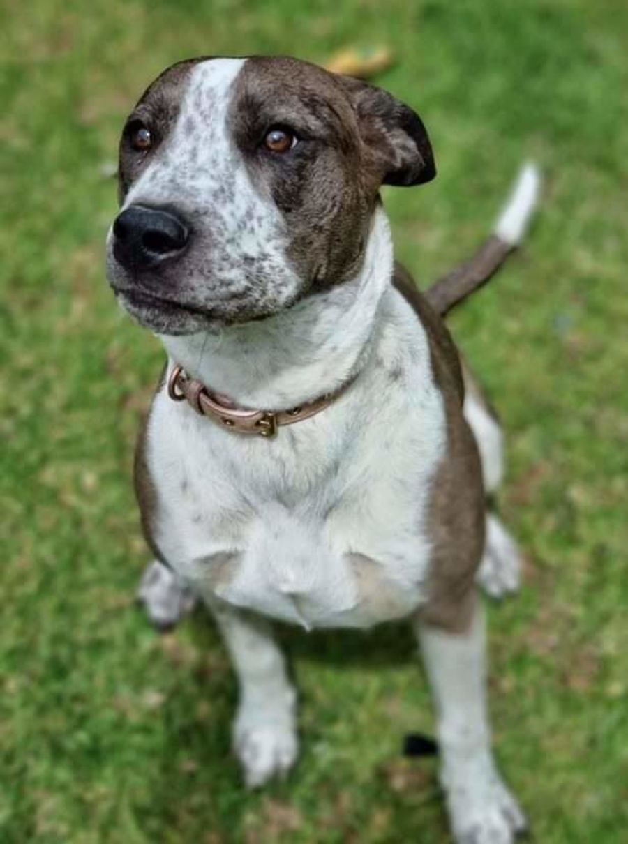 Wanda is a female 8 month old medium - large breed staffy mix. She has a unique look. She is super affectionate and people loving. Being a young dog she is extremely active and will require a significant amount of training. She gets super excited when she sees people and does jump all over them with excitement, so due to this we recommend a home with no young children and older children who are used to big bouncy breeds. Unfortunately Wanda can't live with cats as hasn't been well socialised so either a no cat home or separated areas. We are looking for a person who has large dog breed experience and is prepared to give this sweet girl the training and time she needs. Her adoption fee is $400 which includes microchipping, vaccination, desexing, registration, worming, flea treatment and a bag of dog food. Please call 6583 3488.