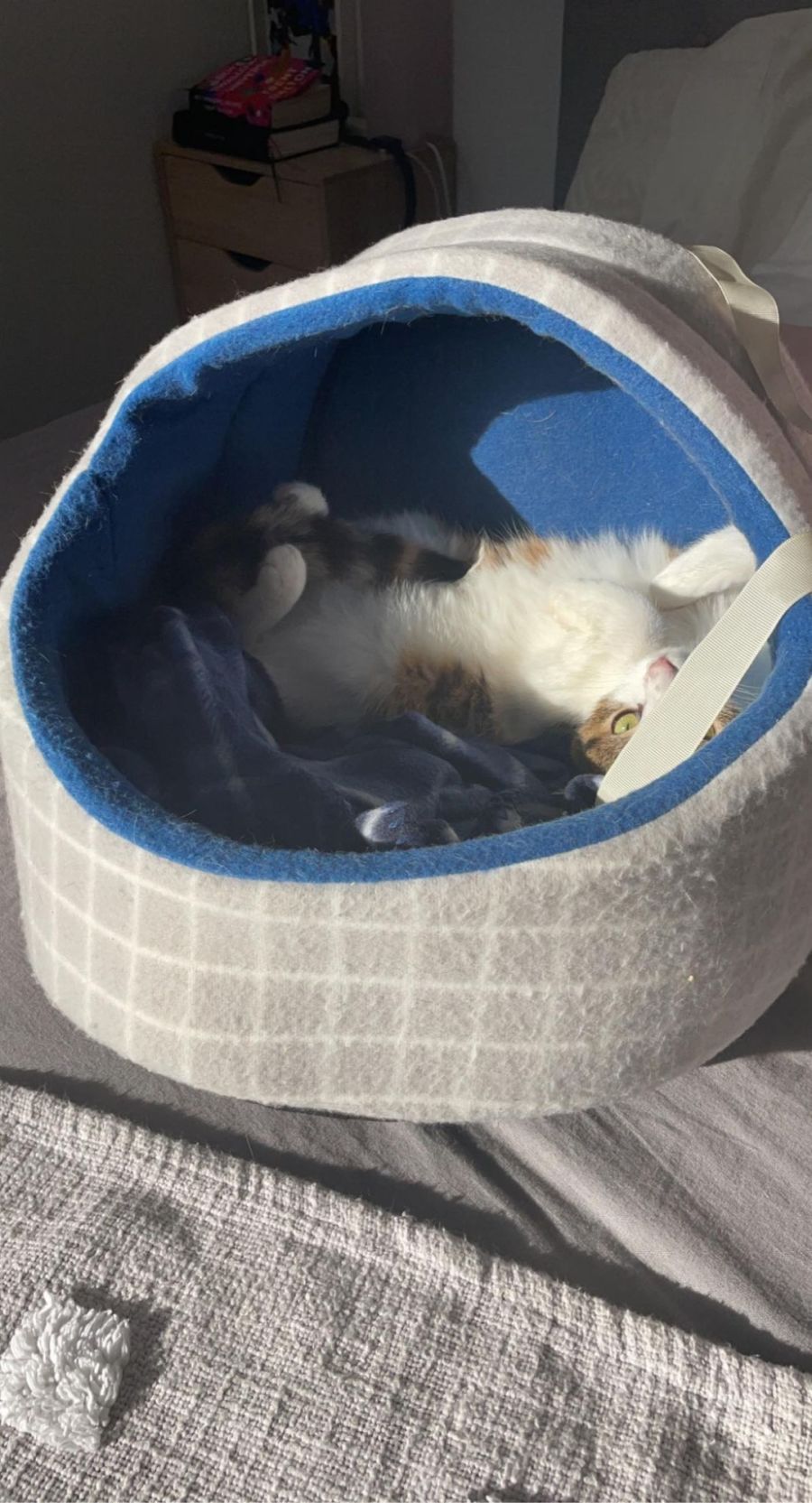 Tinker is an exceptionally pretty little cat. She is quite petite and has beautiful colours. Tinker is very shy and isn’t keen on lots of pats or cuddles, however she happily coexists with people and will sit quietly in the room with you. This makes her a very pleasant, easy, quiet little companion! Although she won’t bother you for cuddles, she will happily accept a Dine Creamy Treat straight from your hand! As Tinker is still quite young, she loves to play and you may often find toys moving all over the house from one place to another frequently! She happily keeps herself entertained, usually playing throughout the night in the living room by herself. Throughout the day she often spends it sitting on the window sill, watching the world go by. She has one specific nap spot, which is her cat bed hidden underneath the spare bed so she is not disturbed. As Tinker is not a cuddly cat, she would suit an adult household. I could particularly see Tinker happily living with someone who lives alone and is in need of a gentle companion!