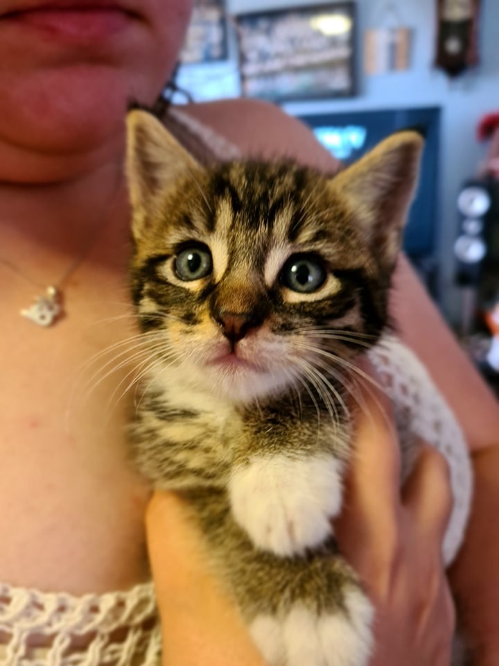 Baelfire, a classic brown tabby, is the smallest of his brothers. He has a gentle meow and demeanor much unlike his family. He loves his siblings and the family dog and to explore.-