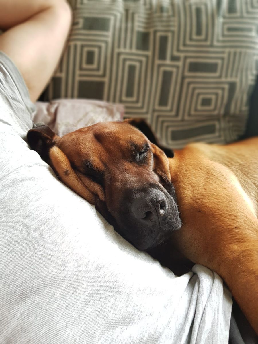 Meet Dougie, the smoochie South African Mastiff X. Dougie is 4-years-old and has spent the last year learning how to live “the good life”. This boy loves a sunny patch in a quiet yard to snooze in and a good belly rub in his bed. Dougie has taken very well to training and is very treat motivated. He has learnt several commands, including ‘sit’, ‘drop’, ‘leave it’, ‘yes’, ‘wait’, ‘paw’, ‘tummy’ and ‘yours’. Dougie is still working on his recall as he can get distracted by an interesting smell or noise.