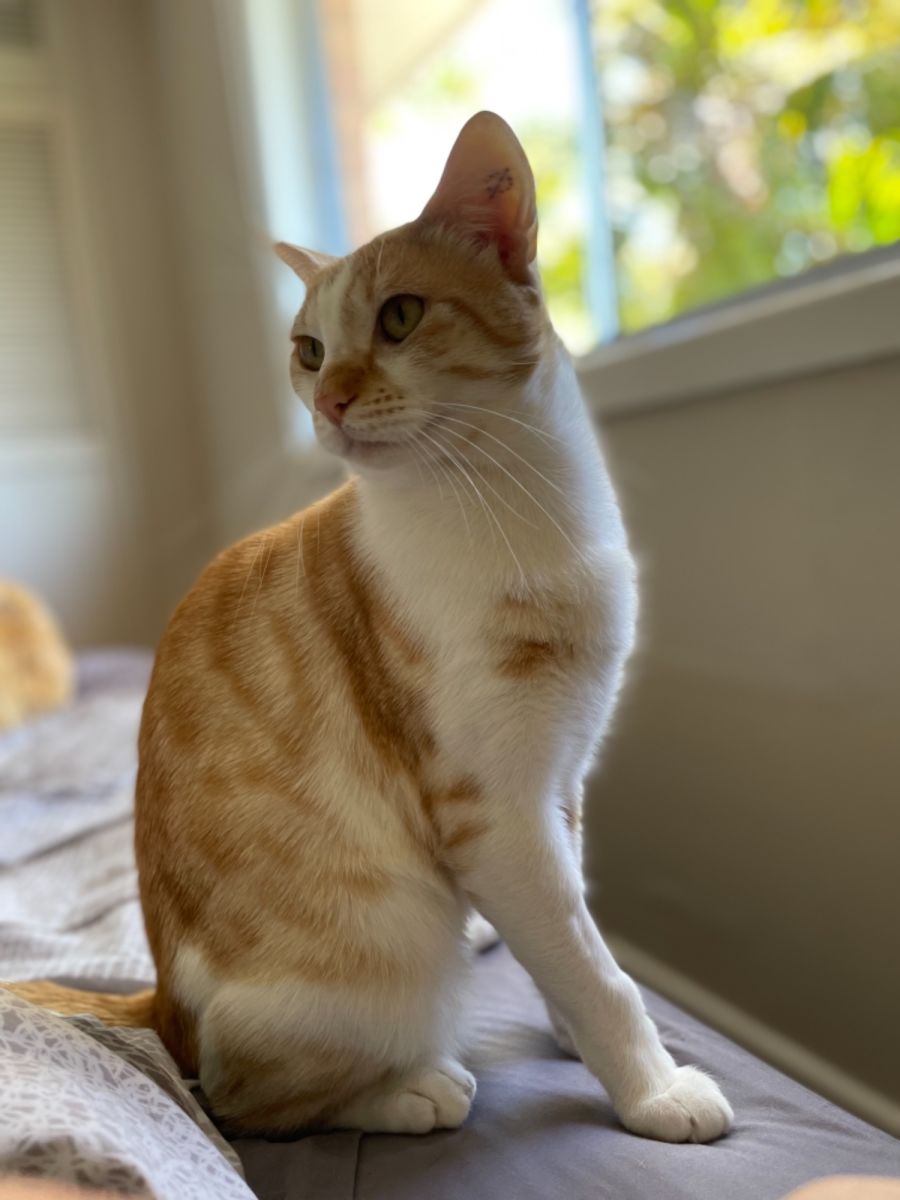 Neddy is a sweet and friendly white and ginger cat. He loves to be around people and gets along well with other cats. He loves to jump up on the sofa and rest his head and paws on your leg and nap the afternoon away. Neddy is super playful and loves tossing his toy fish into the air and chasing it.