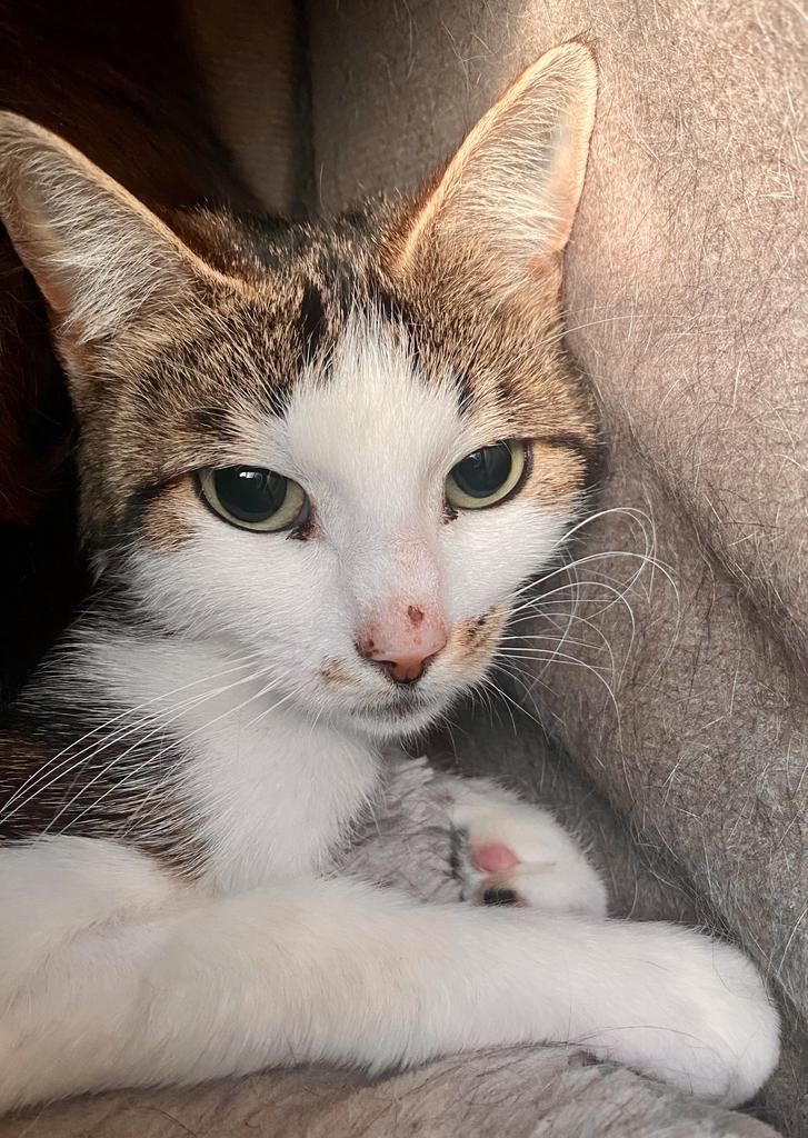 Bertram is a medium small cat, with white coat and random tabby patches that are unique and adorable and a stripey tabby tail. He has a tiny squeaky meow quite at odds with his tomcat appearance (also utterly adorable).