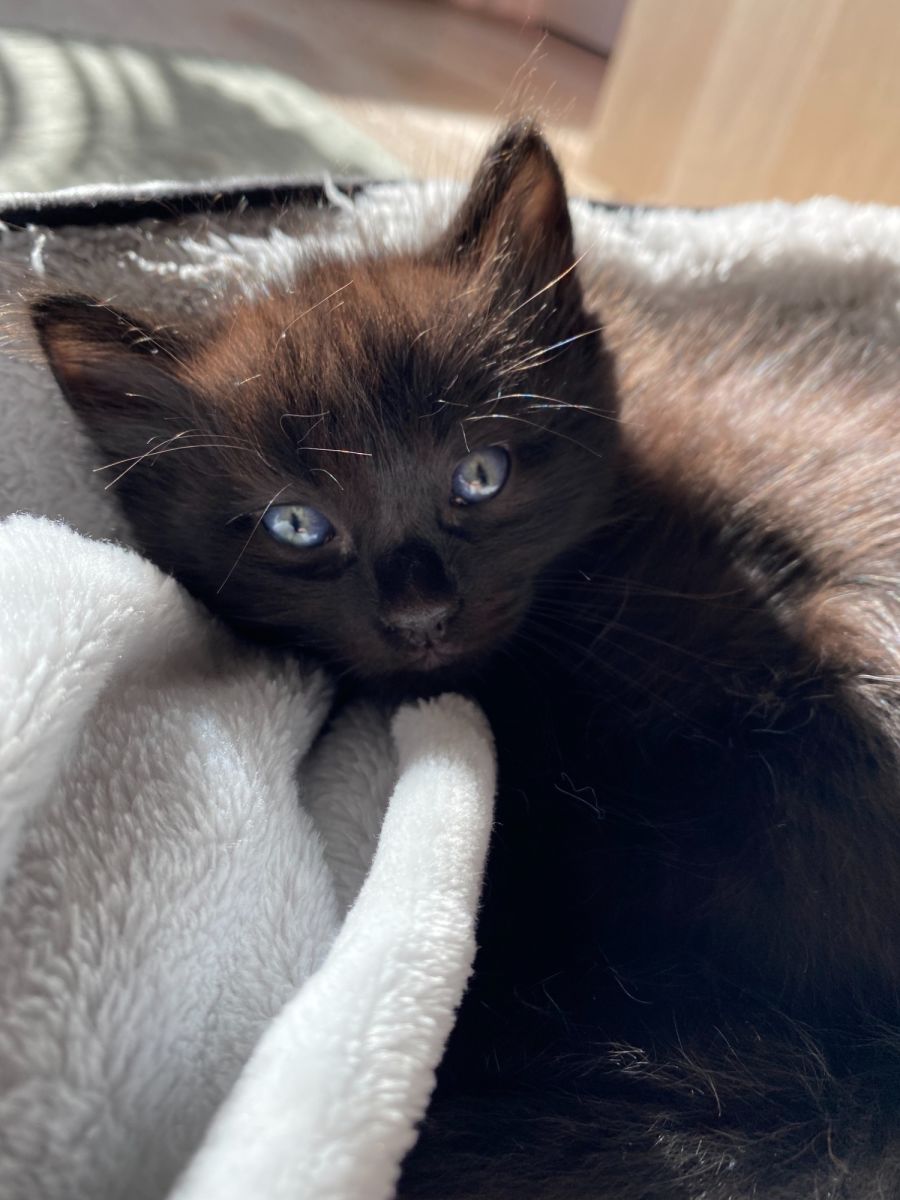 Aero is a super chill and gentle chocolatey guy who absolutely loves cuddling up with a fluffy blanket. He can often be found in a cosy bed with his head stuck under the covers for extra warmth. He loves pats and is the first of his siblings to take the leap into being a lap cat. Aero loves toys, and chasing his siblings Bueno and Mars around the house. You’ll often find them cuddled up together.