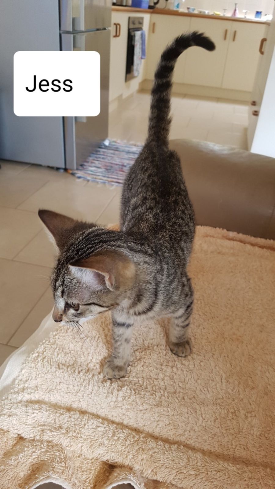 Jess is a beautiful little girl. She is very affectionate, happy to sit on your knee for a cuddle. She plays well with her siblings, even wrestling with her much bigger brother Teddy. Jess is a gentle well adjusted little girl who would fit into most households.